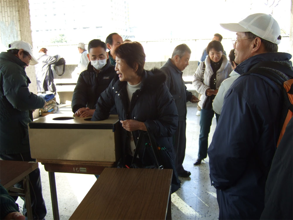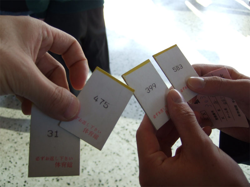 東京都墨田区では、毎月第3土曜日(たぶん)に、翌月のコート取り抽選会があります。なので、この日は墨田区の体育事務所に練習前にみんなで集合し、コート抽選に並ぶわけです。