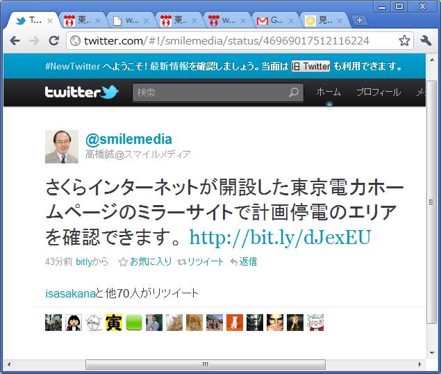 3/14(月)より、東京電力管内では計画停電が始まります。生活に大きな影響の出る施策ですが、日曜日の遅くにエリアが発表されたため、対応に時間がとれていない状態の方も多いのではないかと思います。一つの市町村区で、複数のグループに入っている場合もあり、いったい自分がどの時間帯なのかもTV報道ではわかりずらい。また、東京電力のホームページ(tepco.co.jp)がアクセス集中でつながりにくい状態です。そんな中、東京電力のミラーサイトをさくらインターネットさんが立ち上げてくださったようです。