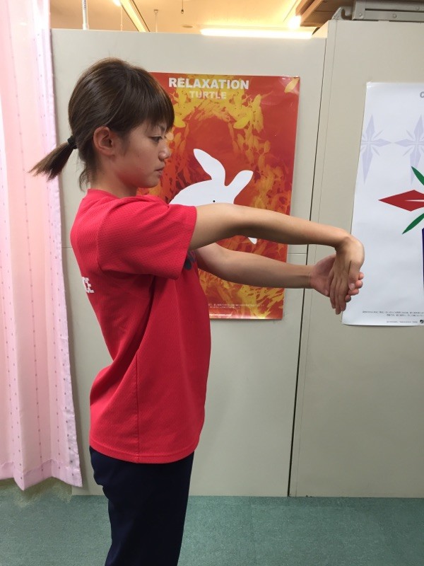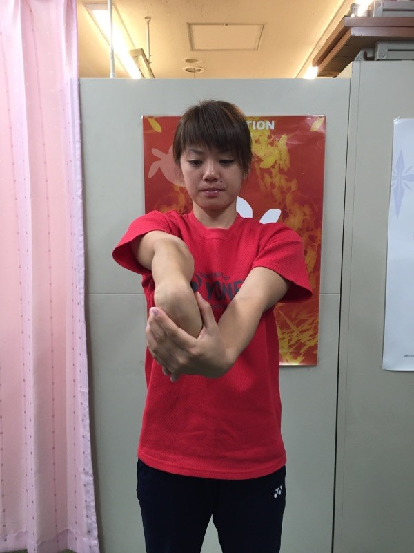 肘を伸ばし、もう一方の手で手首を返すように伸ばします。