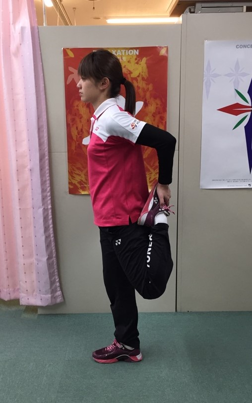 曲げている膝が後ろにいくよう、脚の付け根(股関節)から伸ばす意識で行いましょう。